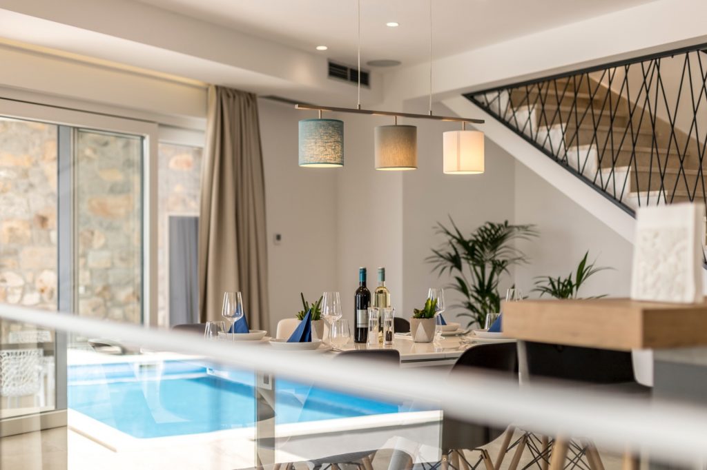Ground floor of the villa is a comfortable living room with kitchen, dining room, one double bed room and bathroom. With large glass walls living room is connected with outdoor dinning terrace and heated swimming pool area.